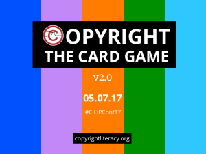 Jane and I are very excited to be playing copyright the card game at the CILIP Conference 2017 in Manchester. We’re not just excited because it gives us the chance to geek out about copyright with all of the lovely CILIP delegates, but also because this is the first unveiling of version 2 of the card game (for more on the history of the game, see here).