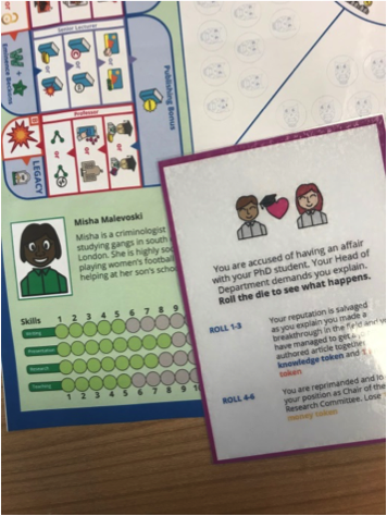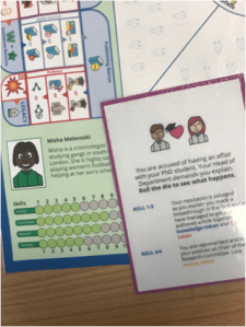 This round started with wildcards. All teams reacted with a big “OH NO!!” to the wildcards. Clearly, there was some turbulence in our characters’ lives. One of the cards picked by the criminologists revealed that this team was accused of having an affair with a PhD student. We are all shocked! Misha Maleovski how could you!? The dice is rolled to determine the outcome which created an even larger discussion as the dice decides that the affair is forgotten because the researcher makes a breakthrough and gets a jointly authored article with the PhD student.