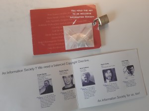 She also has a question for librarians right at the end of the podcast, about whether any institutions maintain a collection of copyright advocacy materials. Teresa has a small collection of material from the European copyright directive (2001) campaign, which ideally she would like to make available to anyone researching this area in future (See photo on the right).