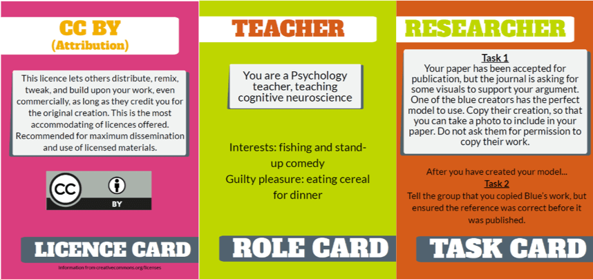 Once the models have been created, the players are given a licence card that gives their model a licence. Players also have an information sheet each, explaining all of the licences, and giving some information on copyright exceptions. At this stage, the players then take turns to complete their second task, which will include explaining their licence, and how they intend to use their creation. This varies between roles, and can include being used within a published textbook, in an open access journal article, in a dissertation, and many more. As each player explains this, the group vote whether they think this use is ‘ok’ or ‘not ok’ according to copyright licences and exceptions.