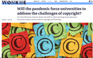 This week has been a really hectic week for us both and we have just delivered our 13th webinar in our weekly series hosted by ALT. However, we were absolutely delighted to see a blog post we have been writing for a month or so finally see the light of day on Tuesday this week. Chris and I are no strangers to writing about copyright, but I had been going on at him for some time about writing for WONKHE, the HE policy blog, to try and get our message about copyright literacy outside the echo chamber. We both feel strongly that working within our community is really important, but also advocating for a recognition of the work that is being done at a higher level is needed. This is why it was really exciting to see our post on this prestigious blog. Rather than reproduce the text of it here, if you haven’t seen it do pop across to WONKHE to read the post in full, it’s entitled ‘Will the pandemic force universities to address the issue of copyright?‘