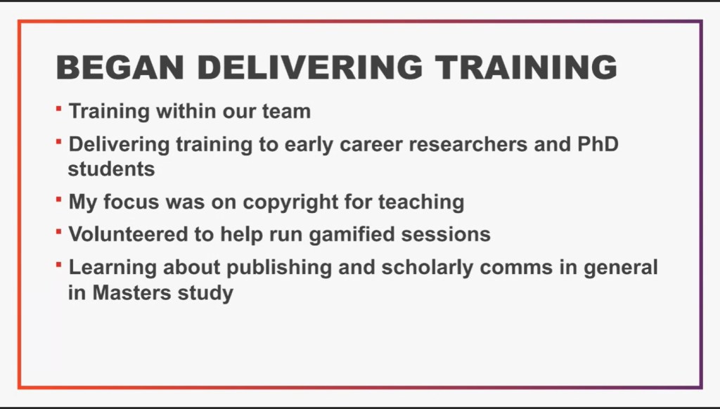 The speakers at this event highlighted a range of resources and support that have helped them to become Specialists many of which reflect my own experience and are included in the UK Copyright Education & Training resources : COOL SIG BLOG (alt.ac.uk) compiled and published by ALT CoOL SIG.